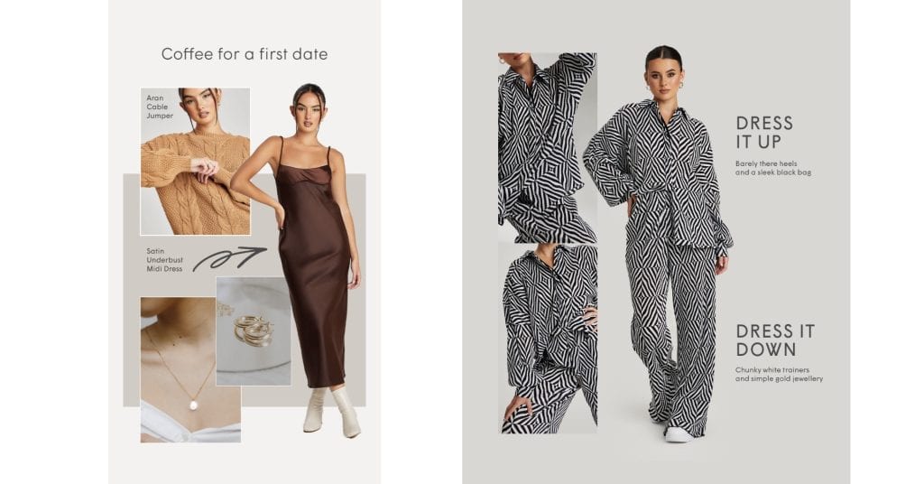 A simple, yet fun way to engage an audience is to change up how your content looks. Using graphics on imagery will elevate your feed and give audiences a reason to follow your account. These can be informational, such as 'how to style' certain pieces, or you can lean into more trending aesthetic ways of creating graphics. This is a great way of repurposing already existing imagery to create new content.